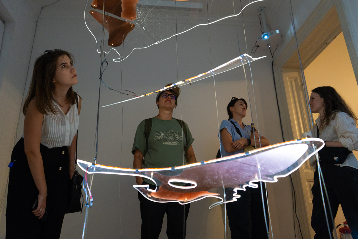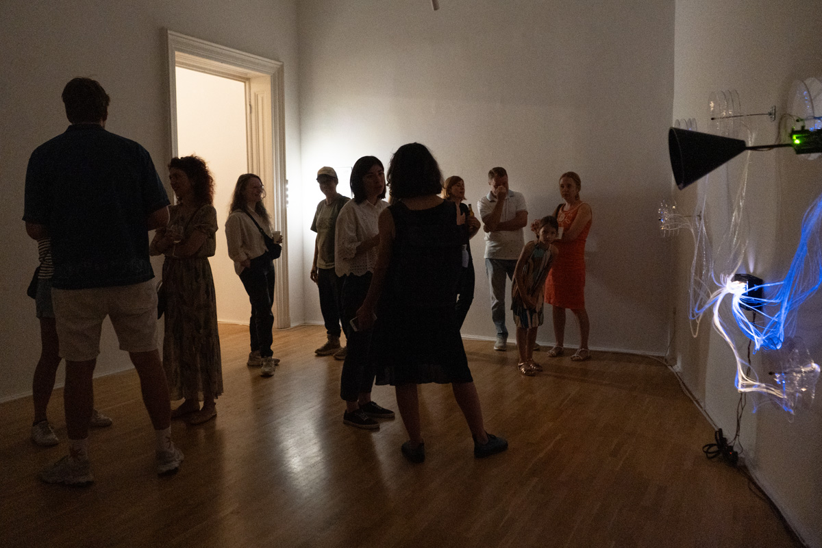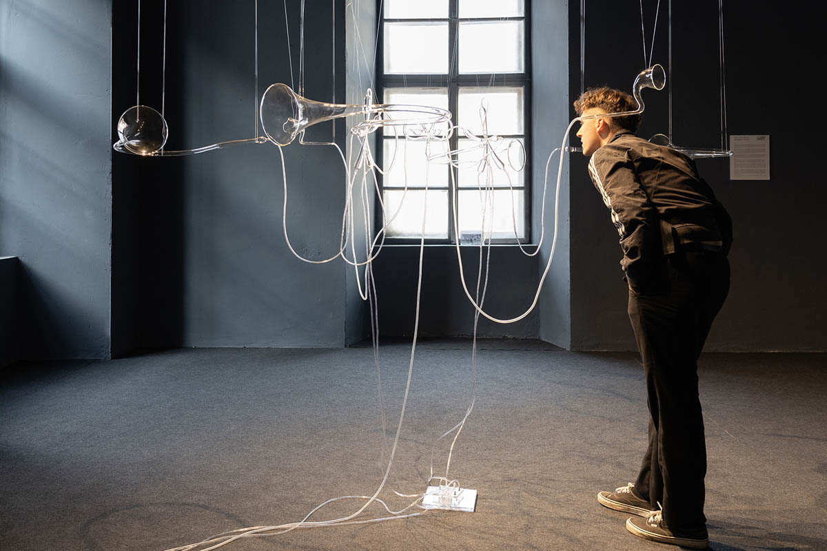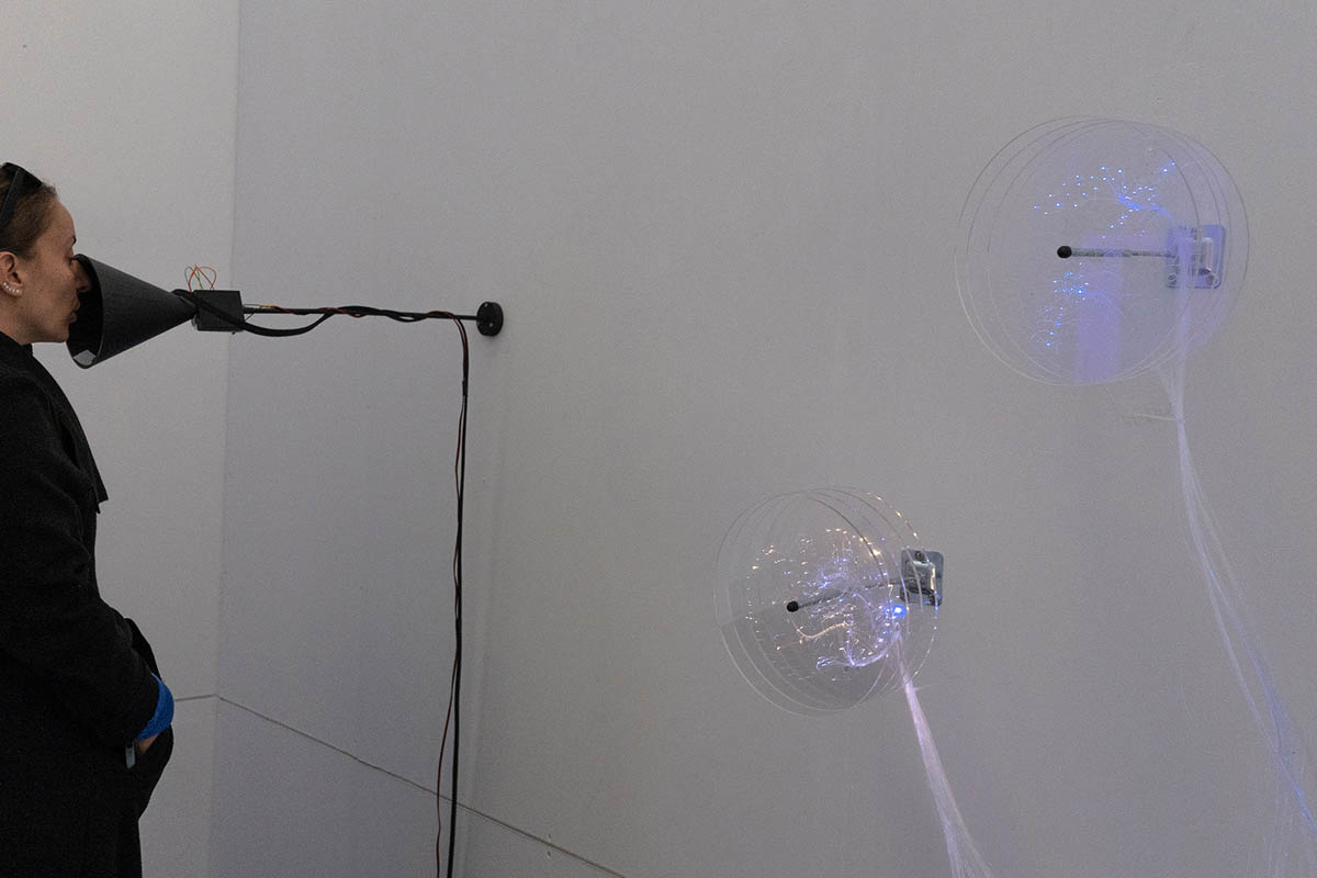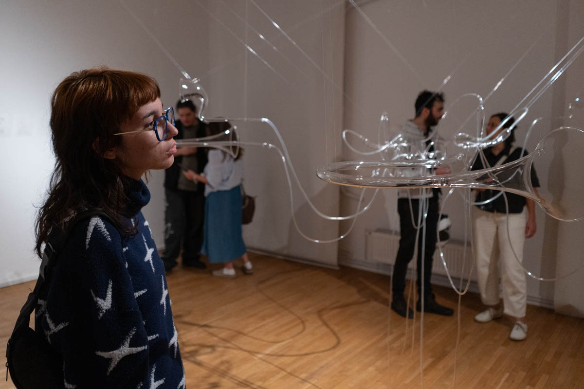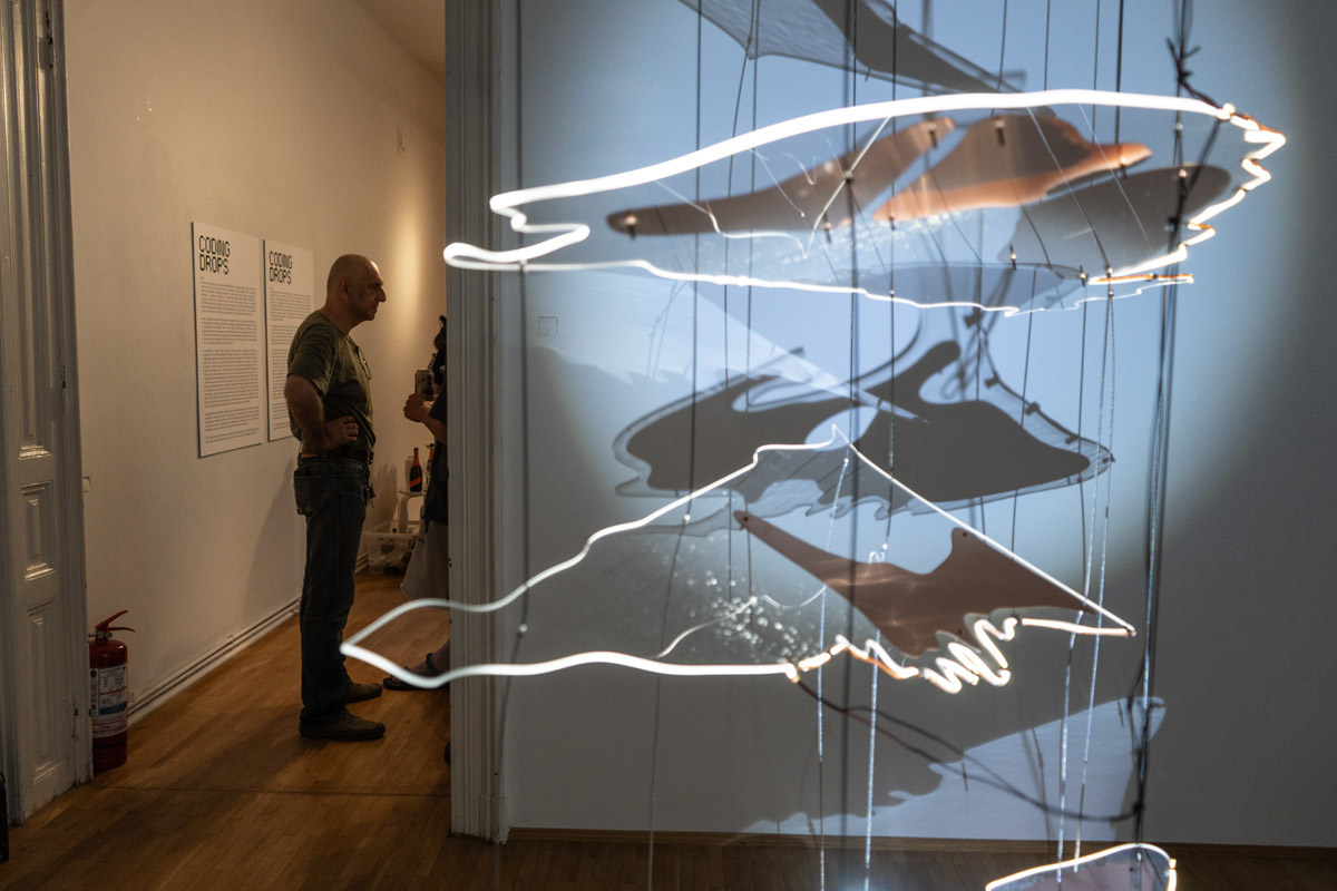 Coding Drops continuă explorarea interdisciplinară a Asociației Qolony asupra teritoriilor modelate de apă, precum Delta Dunării, extinzând această investigație către intersecțiile dintre senzorialitatea mediului, comunicarea mediată prin fluide și poetica percepției. În colaborare cu Institutul Național de Cercetare-Dezvoltare Delta Dunării (INCDDD) și Institutul Național de Cercetare-Dezvoltare pentru Fizica Laserilor, Plasmei și Radiației - INFLPR, expoziția își ancorează gesturile speculative într-un cadru de cercetare științifică și artistică contextualizată. Artiștii au realizat expediții pe teren și observații in situ, au colectat probe, au dialogat cu cercetători și au experimentat cu tehnologii optice și bio-inspirate. Astfel, instalațiile prezentate reflectă asupra fluidității nu doar ca proprietate materială, ci ca mod de gândire – un cadru conceptual care respinge controlul, cultivă relaționarea inter-specii și îmbrățișează incertitudinea. Ioana Vreme Moser, Mark IJzerman și Floriama Cândea explorează, fiecare, câte o dimensiune a sistemelor fluide ca forme de expresie și interpretare. De la ritmurile nautofoanelor la pulsațiile luminoase declanșate de respirație, până la urmele chimice ale apelor contaminate, Coding Drops ne invită să percepem lumea nu prin structuri fixe, ci prin sisteme instabile, permeabile, reactive. În lucrările lor, fluidele devin limbaje, corpuri senzoriale, purtătoare de memorie și transformare. Ele nu doar transportă informație sau memorie – ci modelează, distorsionează, suspendă, granițele dintre mesaj și zgomot, dintre structură și derivă. O picătură de apă poate păstra urme chimice ale unei istorii industriale. O respirație poate declanșa un schimb invizibil. Un semnal sonor poate traversa ceata cu un ritm codificat. Astfel, fluidele devin deopotrivă semnal și mediu – arhive ecologice și instrumente ale speculației. În Nautophone Telecom, Ioana Vreme Moser reconstruiește un circuit pneumatic, în care impulsuri de aer comprimat reactivează semnalele acustice folosite odinioară pentru navigație în Delta Dunării – transformând presiunea aerului în prezență acustică și expresie ritmică. În Neural Bloom, Floriama Cândea creează o rețea de noduri sculpturale luminoase, inspirate de plante acvatice și de relațiile de schimb dintre ele. Fiecare nod „respiră” în răspuns la CO₂-ul din expirația vizitatorului – aducând în prim-plan atmosfera ca bun comun fragil și partajat. În Watershed (Final Call), Mark IJzerman urmărește traseul apei contaminate care străbate straturile filtrante ale deltei, folosind textile reactive, sunete subacvatice și proiecții microscopice pentru a face vizibilă comunicarea deficitară în ecosisteme supuse presiunii, poluării. În fiecare dintre aceste lucrări, sistemele fluide modulează informația într-un mod care rezistă repetiției și controlului. Fluidele leagă corpuri, formează infrastructuri comune și creează premisele unei colaborări involuntare. Ele se schimba, pulsează și se află mereu în pragul unei noi forme. În acest fel, oglindesc logica ecosistemelor și a dinamicilor sociale – non-lineare, neimediate, reactive, cateodata încurcate și lente în procesul de refacere. Într-o lume marcată de temperaturi în creștere, semnale care dispar și ecologii în transformare, poate că nu contează atât de mult cât de clar vorbim, ci cât de atent învățăm să ascultăm