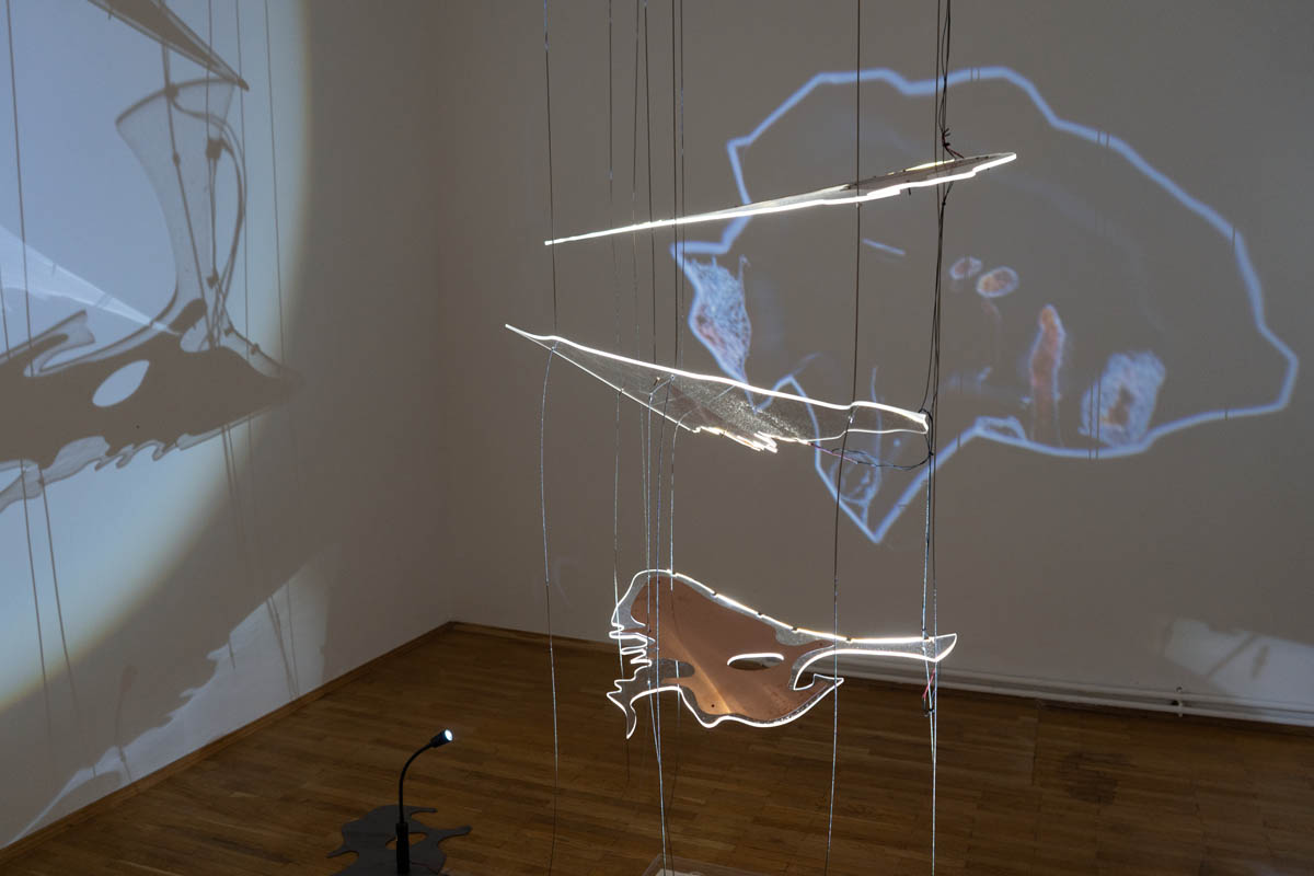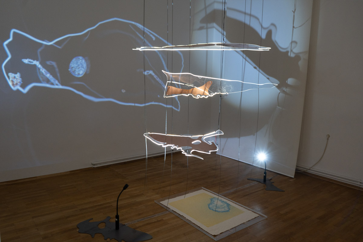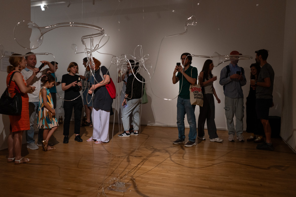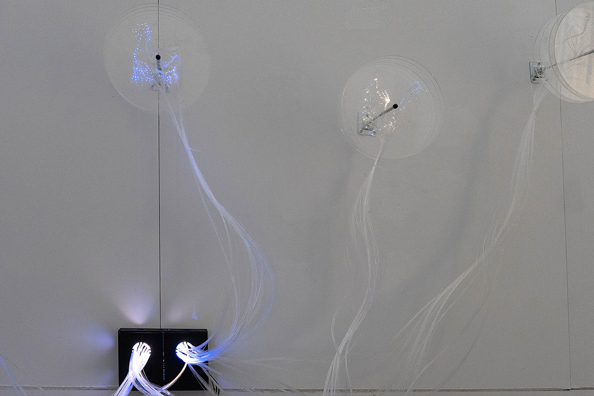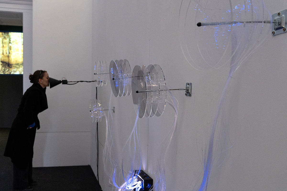 Coding Drops continuă explorarea interdisciplinară a Asociației Qolony asupra teritoriilor modelate de apă, precum Delta Dunării, extinzând această investigație către intersecțiile dintre senzorialitatea mediului, comunicarea mediată prin fluide și poetica percepției. În colaborare cu Institutul Național de Cercetare-Dezvoltare Delta Dunării (INCDDD) și Institutul Național de Cercetare-Dezvoltare pentru Fizica Laserilor, Plasmei și Radiației - INFLPR, expoziția își ancorează gesturile speculative într-un cadru de cercetare științifică și artistică contextualizată. Artiștii au realizat expediții pe teren și observații in situ, au colectat probe, au dialogat cu cercetători și au experimentat cu tehnologii optice și bio-inspirate. Astfel, instalațiile prezentate reflectă asupra fluidității nu doar ca proprietate materială, ci ca mod de gândire – un cadru conceptual care respinge controlul, cultivă relaționarea inter-specii și îmbrățișează incertitudinea. Ioana Vreme Moser, Mark IJzerman și Floriama Cândea explorează, fiecare, câte o dimensiune a sistemelor fluide ca forme de expresie și interpretare. De la ritmurile nautofoanelor la pulsațiile luminoase declanșate de respirație, până la urmele chimice ale apelor contaminate, Coding Drops ne invită să percepem lumea nu prin structuri fixe, ci prin sisteme instabile, permeabile, reactive. În lucrările lor, fluidele devin limbaje, corpuri senzoriale, purtătoare de memorie și transformare. Ele nu doar transportă informație sau memorie – ci modelează, distorsionează, suspendă, granițele dintre mesaj și zgomot, dintre structură și derivă. O picătură de apă poate păstra urme chimice ale unei istorii industriale. O respirație poate declanșa un schimb invizibil. Un semnal sonor poate traversa ceata cu un ritm codificat. Astfel, fluidele devin deopotrivă semnal și mediu – arhive ecologice și instrumente ale speculației. În Nautophone Telecom, Ioana Vreme Moser reconstruiește un circuit pneumatic, în care impulsuri de aer comprimat reactivează semnalele acustice folosite odinioară pentru navigație în Delta Dunării – transformând presiunea aerului în prezență acustică și expresie ritmică. În Neural Bloom, Floriama Cândea creează o rețea de noduri sculpturale luminoase, inspirate de plante acvatice și de relațiile de schimb dintre ele. Fiecare nod „respiră” în răspuns la CO₂-ul din expirația vizitatorului – aducând în prim-plan atmosfera ca bun comun fragil și partajat. În Watershed (Final Call), Mark IJzerman urmărește traseul apei contaminate care străbate straturile filtrante ale deltei, folosind textile reactive, sunete subacvatice și proiecții microscopice pentru a face vizibilă comunicarea deficitară în ecosisteme supuse presiunii, poluării. În fiecare dintre aceste lucrări, sistemele fluide modulează informația într-un mod care rezistă repetiției și controlului. Fluidele leagă corpuri, formează infrastructuri comune și creează premisele unei colaborări involuntare. Ele se schimba, pulsează și se află mereu în pragul unei noi forme. În acest fel, oglindesc logica ecosistemelor și a dinamicilor sociale – non-lineare, neimediate, reactive, cateodata încurcate și lente în procesul de refacere. Într-o lume marcată de temperaturi în creștere, semnale care dispar și ecologii în transformare, poate că nu contează atât de mult cât de clar vorbim, ci cât de atent învățăm să ascultăm